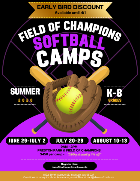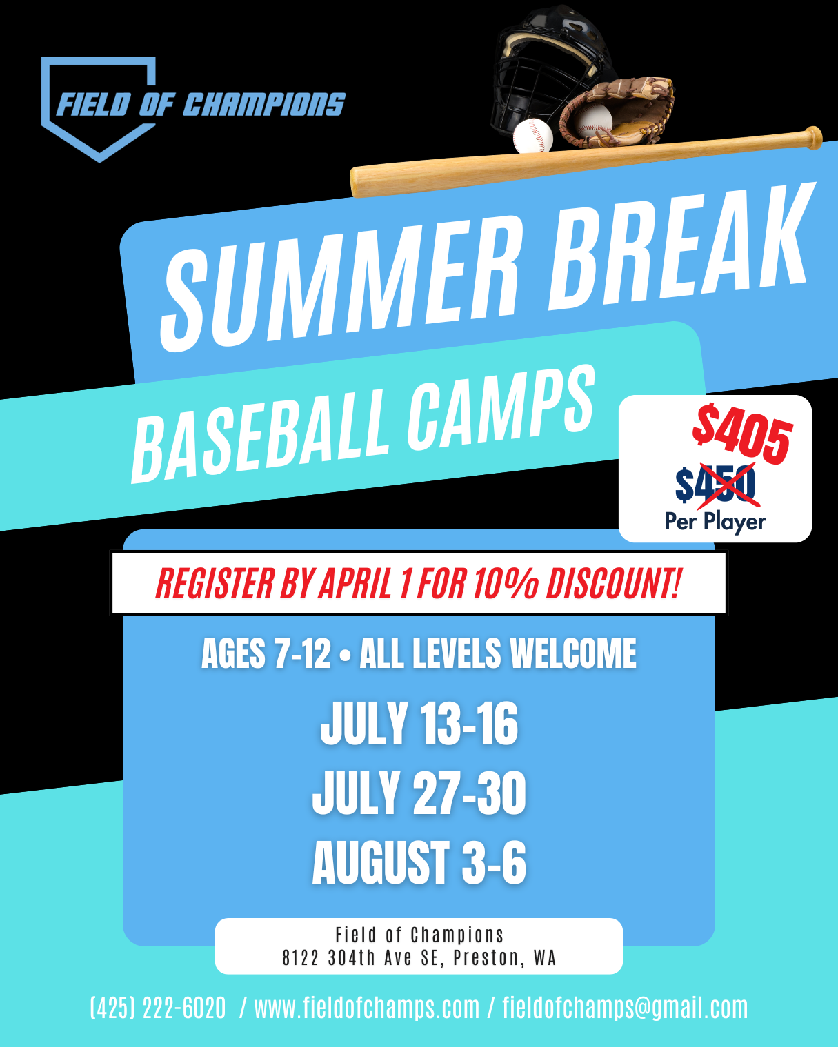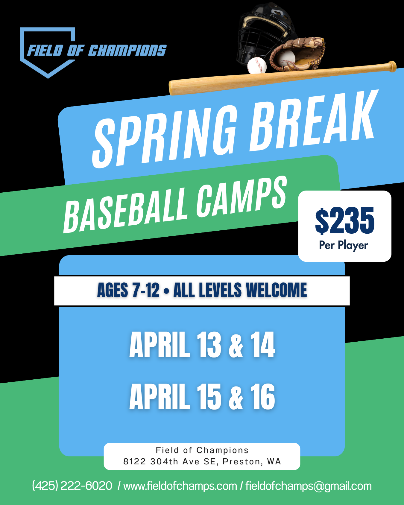 WELCOME! Field of Champions, located just off I-90 in Preston, WA, offers a spacious, 15,000+ square-foot facility designed for athletes of all ages. With fully retractable cages, bullpen lanes, and cutting-edge equipment, it provides a versatile training ground for baseball and softball enthusiasts. Whether you're looking for individual instruction, cage rental, team training packages, or fun events like birthday parties, Field of Champions fosters a supportive environment focused on skill development and a love for the game.